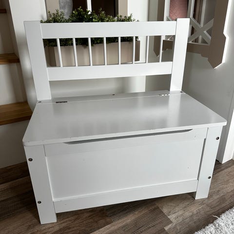 IKEA barnbänk med förvaring i vit färg. Bänken har ryggstöd med spjälor och sittdel som kan fällas upp för att komma åt förvaringsutrymmet under. Lämplig för barnrum för förvaring av leksaker, kläder eller andra tillhörigheter samt som sittplats.