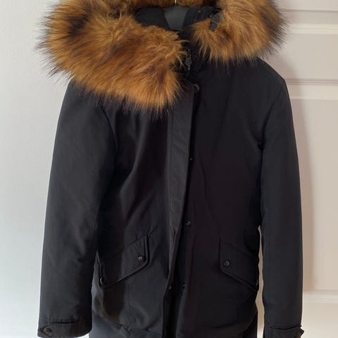 Lebek Daune dunjacka för dam i storlek M. Jackan är brun med quiltat mönster och avtagbart bälte i midjan. Utrustad med huva med pälsimitation och knäppning med dragkedja och tryckknappar framtill. Ytterficka på sidorna. Fodrad med dun för extra värme, lämplig som ytterplagg under kallare väder.