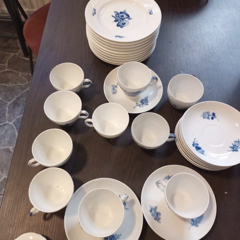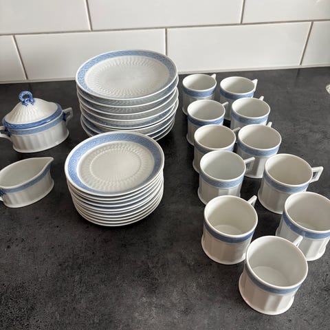 12 moccakoppar med fat, 14 assietter, 1 gräddkanna, 1 sockerskål. Perfekt skick, knappt använt