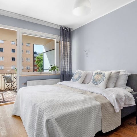 Kontinentalsäng från MIO, Cape farewell med stoppad huvudgavel. Mellangrått tyg. Dubbelsäng 180x200cm där ena sidan är medelhård och andra sidan är fast även om den upplevs relativt mjuk.