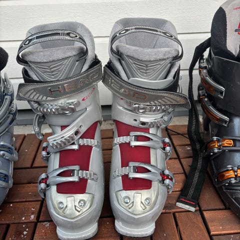 Alpina pjäxor från Head använda 5ggr, stl 39 och ett par svarta Tecnica‑pjäxor. Tecnica‑pjäxorna har sulmått 295 mm