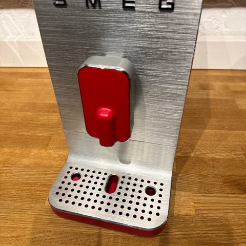 Smeg espressomaskin i vit färg. Maskinen har inbyggd manometer på fronten och ång-/varmvattensfunktion med separat munstycke. Droppbricka och koppställ finns på framsidan. På bilden syns även en tillhörande mjölkkanna i metall. Lämplig för tillredning av espresso och andra kaffedrycker i hemmet eller på mindre kontor.