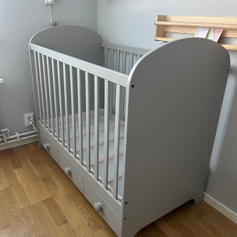 Hyfsat fint skick, mindre märken och små spår efter klistermärken förekommer. Skötbädd och flera praktiska förvaringslådor som kan hängas på övre kanten ingår även om så önskas.