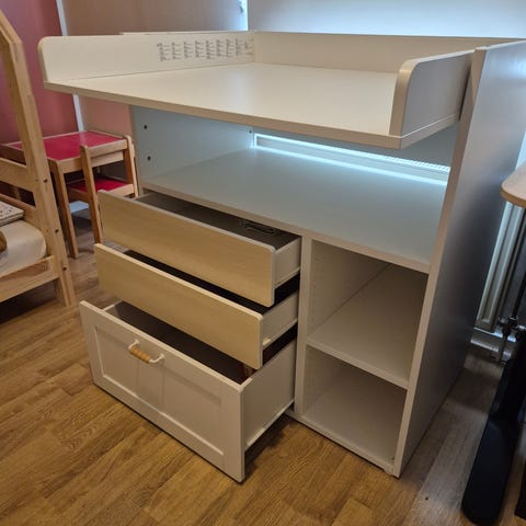 Praktiskt IKEA skötbord (småstad) med rymlig skötyta och höga kanter runtom. Under skötytan finns fyra utdragbara lådor samt öppna hyllfack för övrig praktisk förvaring. Passar i barnrum eller badrum, där extra förvaring behövs i anslutning till skötytan. Smidig modell som enkelt kan omvandlas till ett skrivbord när barnet blivi större.
