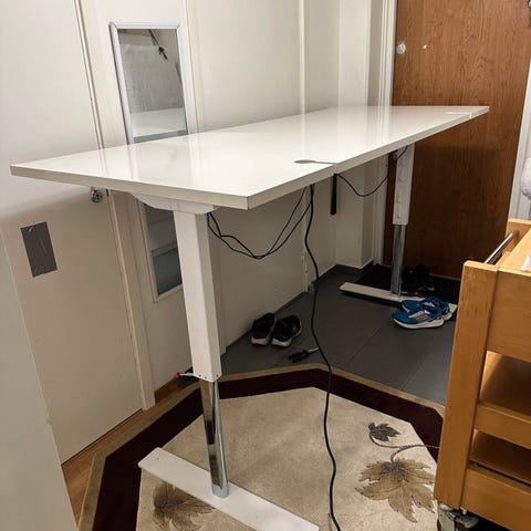 Bra skick. Används ej längre. Förvaring för kabelhantering under bordskivan, finns möjlighet att ställa höjd på det manuellt. Fötterna är även de justerbara.