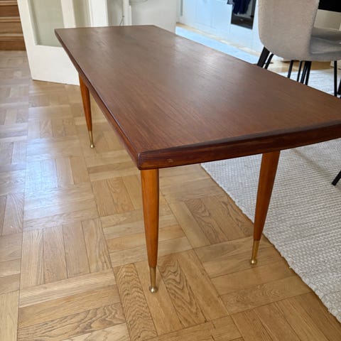 Tidigare iläggsskiva har funnits till bordet men bordsskivan är nu ihoplimmad.