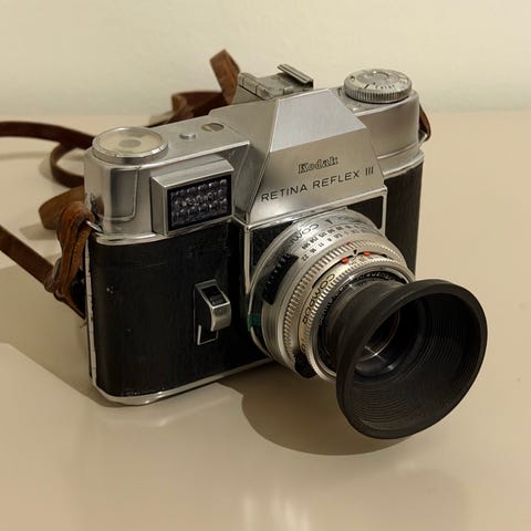 YASHINON-DS 50 mm 1:1.9 AUTO-objektiv sitter på kameran och medföljer affären.