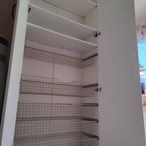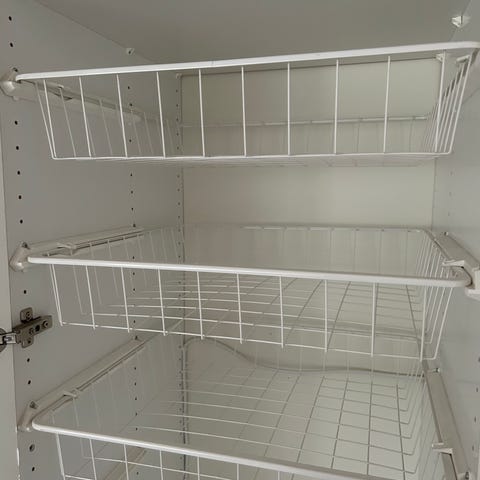 2 st. separata stativ med 10 st. trådbackar i varje. Bredd 45 cm, djup 53,5 cm, höjd 203 cm.