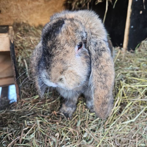 Han är född våren 2022 och är en pigg och snäll kanin. Han är okastrerad, social och van vid människor. Han bor utomhus, vilket han trivs bra med, och passar därför särskilt bra i ett hem som kan erbjuda en trygg och rymlig utomhusmiljö, alternativt flytta inomhus när pälsen bytts till sommarpäls.
