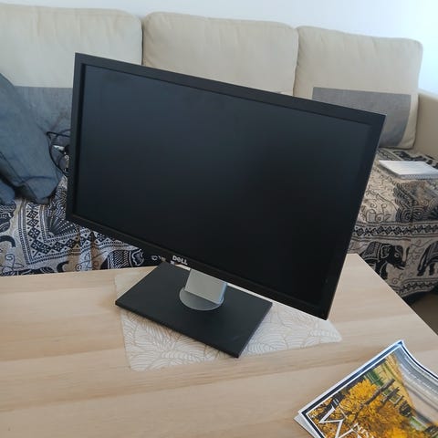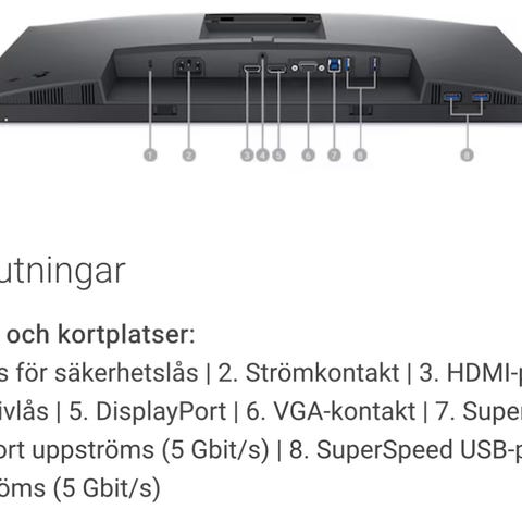 Dell bildskärm med skärmstorlek på 23 tum i svart utförande. Skärmen står på en stabil fot och ansluts med kabel. Passar för användning till stationär dator för kontorsarbete, studier eller allmän datoranvändning.