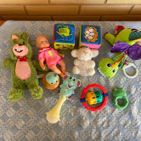 Diverse småbarnsleksaker, hoppboll, plocklåda, klosstorn mm.