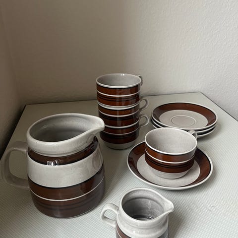 Säljer en fin uppsättning delar ur den klassiska serien Isolde från Rörstrand. Karaktäristisk design i stengods med bruna ränder på melerad botten.