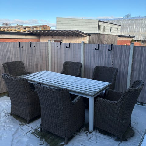 Matgrupp för utomhusbruk bestående av ett avlångt bord och sex stolar i beige konstrotting. Bordsskivan är rektangulär och har släta längsgående skivor i ett hårt material, troligen komposit eller liknande vädertåligt material. Stolarna har armstöd och hög rygg med flätad konstrotting runt om. Passar exempelvis på altan, uteplats eller inglasad balkong.
