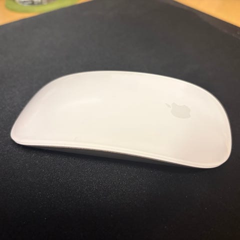 Apple Magic Mouse trådlös datormus i vit färg. Musen har touch-yta för gester och rullning samt optisk sensor på undersidan. Ansluts trådlöst via Bluetooth till kompatibla datorer och andra enheter som stödjer Apples musar. Drivs av batterier som monteras på undersidan. Passar för allmän datoranvändning som webbsurf, kontorsarbete och enkel bildhantering.