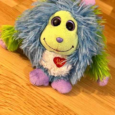 gosedjur i turkos plysch. Mjuk kropp med längre päls. Inuti finns ett batterifack, vilket tyder på att gosedjuret har ljud- och rörelsefunktioner. Passar som mjukdjur och leksak för barn som tycker om mjuka figurer och fantasifull lek.