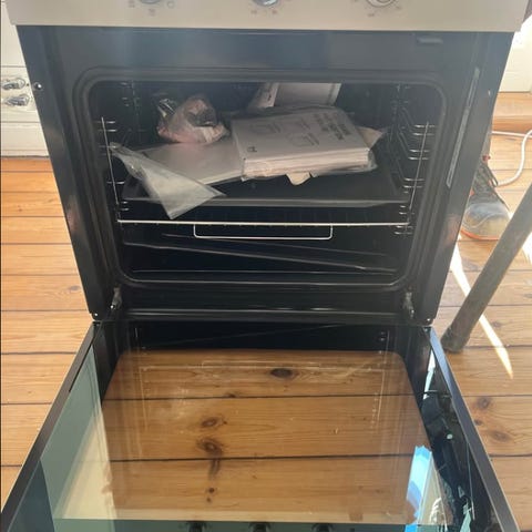 Ugnen har dubbla utdragbara skenor, varmluft, grill, m.m. Tvärt finns inte originalgaller/plåtar.