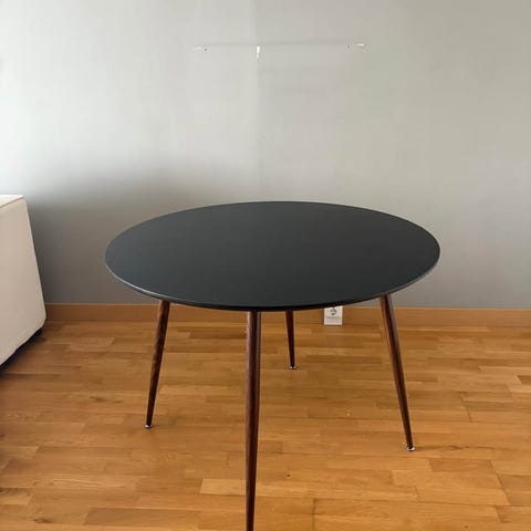 Matgrupp med ovalt expanderbart till runtmatbord och fyra stolar. Bordet har en ljus, rund bordsskiva i glas och ett centralt ben i metall med rund fot. Expanderbart till runt bord (120cm diameter) genom att rotera bordet. Stolarna är stoppade och klädda i blått tyg med rutquiltat mönster, läder på ryggsidan och har svarta metallben. Passar som matgrupp i kök eller vardagsrum för fyra sittplatser.