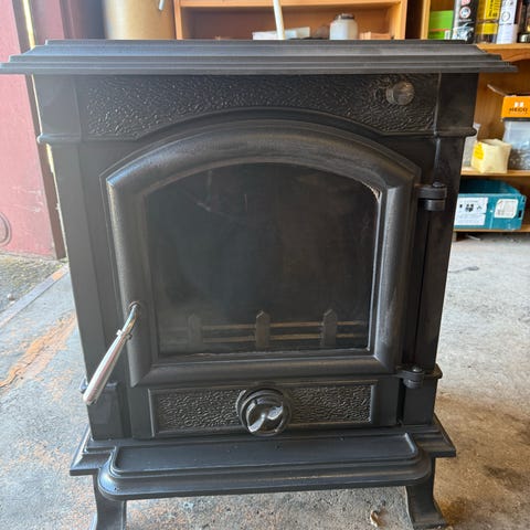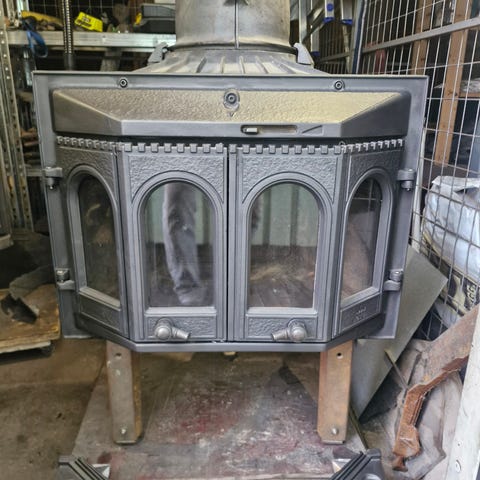 Resolute Gjutjärns kamin från Vermont Casting är i topp skick stålborstat och målad med värmebeständig svart färg, samt bytt glas och nya packningar runt glaset och dörrarna.