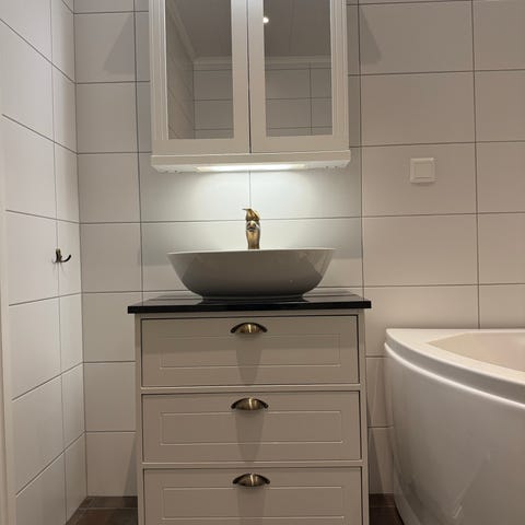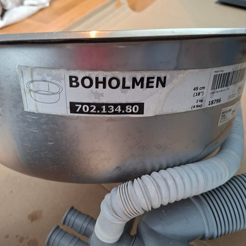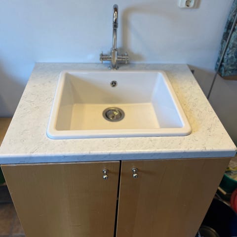 Bänk med integrerad diskho och flera förvaringsskåp. Bänken har en större ho med blandare samt arbetsyta bredvid. Fronterna är profilerade med vertikala spår och har metallhandtag. Under bänkskivan finns både skåp och lådor för förvaring. Passar exempelvis i kök, tvättstuga eller groventré där det behövs både arbetsyta och diskho.