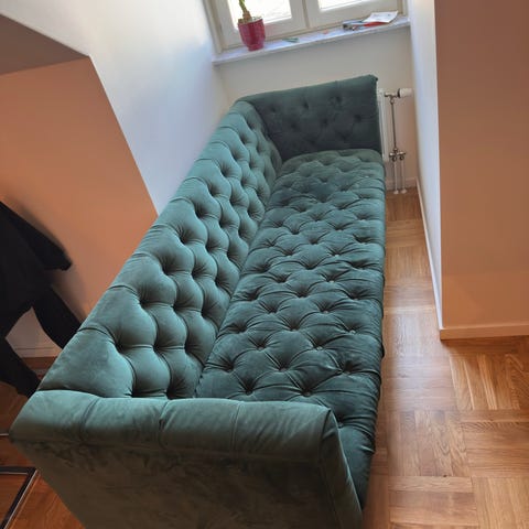 Blå 3-sits sammetssoffa i nyskick