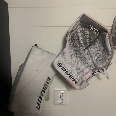 Bauer ishockeymålvaktshjälm i svart färg med galler framtill. Hjälmen är avsedd för ishockey och ger skydd för huvud och ansikte vid spel som målvakt. Passar för användning på isrink vid träning och match. Exakta storleks- och materialuppgifter framgår inte av informationen och kan kontrolleras vid behov på hjälmens märkning.
