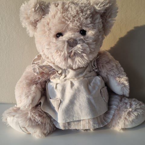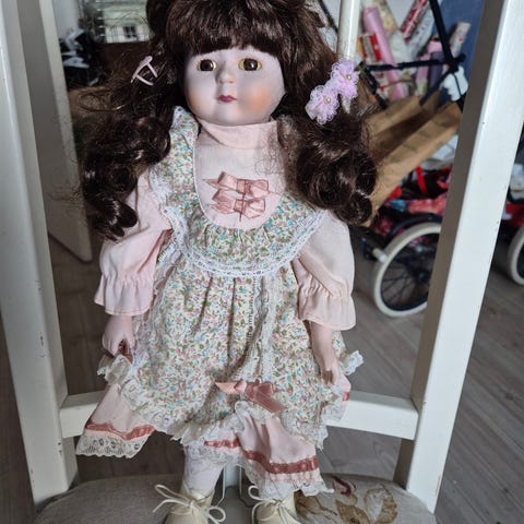 Docka i tyg med ljus hy och broderat ansikte. Dockan har långt ljust hår av garn och bär en rosa klänning med lång ärm samt matchande huvudbonad. Benen har rosa- och vitrandiga detaljer. Passar som leksak eller prydnad i barnrum.