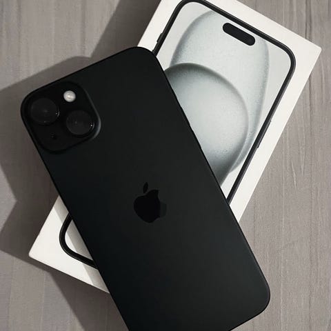 Apple iPhone 15 smartphone med 128 GB intern lagring.