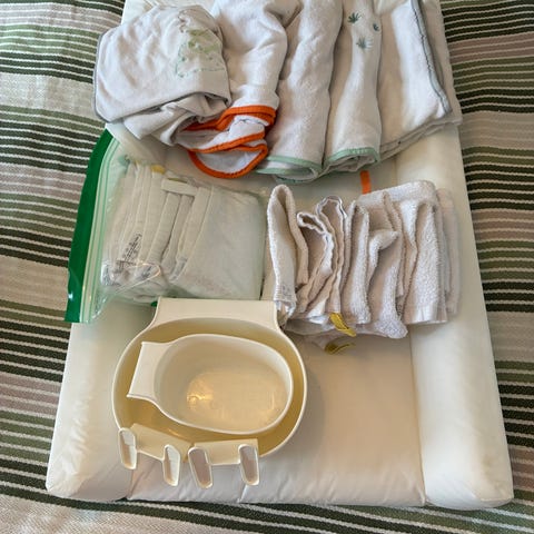 IKEA ihopfällbart skötbord samt separat vit skötbädd. Under skötbordet finns hylla och flera fickor på sidan för förvaring av blöjor, kläder och tillbehör.