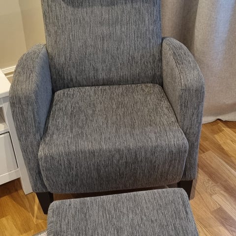 Fåtölj med fotpall och liten nackkudde från Mio i fint skick. Mörkgrått tyg. Finns i Hornsberg och hämtas helgen 14-15 februari eller efter överenskommelse under vecka 8.