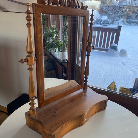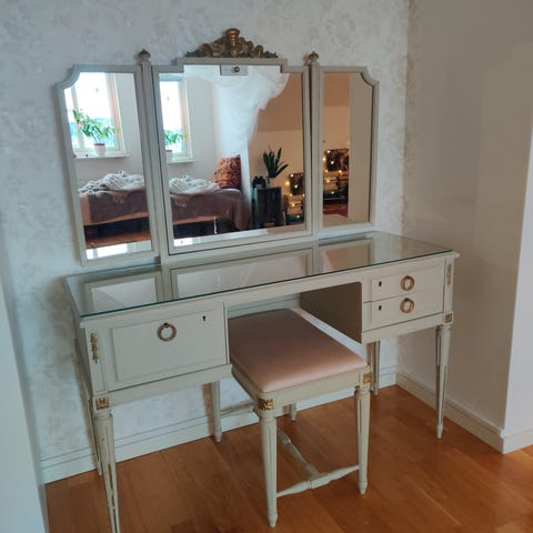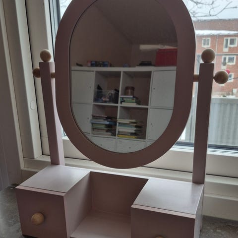 Supersött handgjort pigtittare smink-/spegelbord från 1965 med en liten låda i massiv björk ”signerat på lådans botten”.