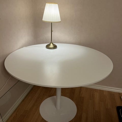 Mio matbord med rektangulär form och vit bordsskiva. Bordet har mörka ben och en slät, ljus yta som ger ett neutralt uttryck. Passar som matbord i kök eller matrum och rymmer flera stolar runt om. Material på bordsskiva och ben framgår inte närmare av uppgifterna.
