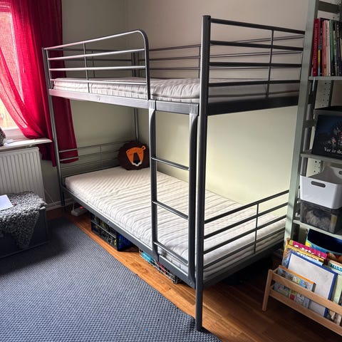 Våningsäng inköpt i juni 2025 (kvitto finns) plus madrass som är inköpt samtidigt ”Åfjäll”. Ribbotten under med madrass är äldre men inget att anmärka på. Går att tvätta överdraget på bäddmadrasserna.