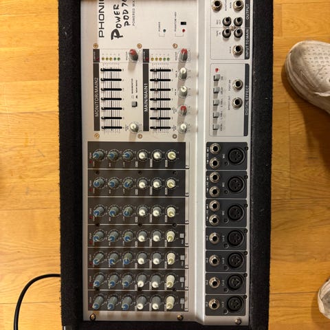 Phonic Powerpod k-12 mixerbord. Kompakt mixer med flera kanaler och inbyggd förstärkare. Utrustad med XLR- och teleingångar, huvudutgångar samt separata reglage för nivå, EQ och effekter per kanal. Passar för ljudmixning vid till exempel repetitioner, mindre spelningar eller enklare PA-lösningar.