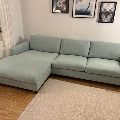 Säljer en bekväm hörnsoffa med blått tyg som passar perfekt i både lägenhet och hus.
