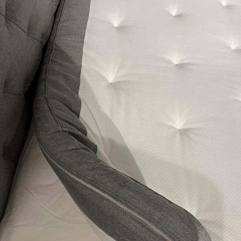 Mio bäddmadrass i vitt med grå kant. Fint skick! Madrassen är avsedd att placeras ovanpå en säng eller resårmadrass för ökad liggkomfort.