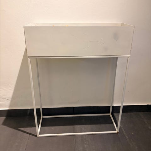 Blomlåda på ben i rektangulär modell. Tillverkad i metall och i vitt trä. Lämplig för plantering av blommor eller örter .