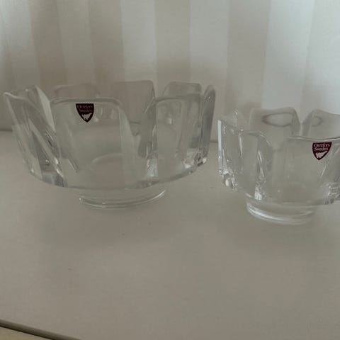 Orrefors ljusstakar i glas. Ljusstakarna är tillverkade i klart glas med dekorativt, facetterat mönster på stjälken och rund fot. Övre del i metall för placering av kronljus.