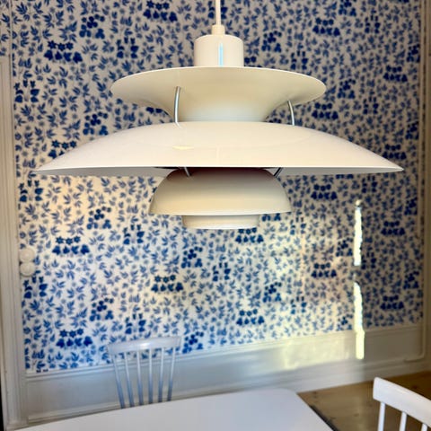 Louis Poulsen PH 5 pendel designad av Poul Henningsen. Taklampa med flerskiktsreflektor i vit färg, utformad för att ge bländfri belysning. Lampan har en diameter på cirka 50 cm och en höjd på cirka 20 cm. Passar för E27-ljuskälla, upp till 75 W enligt specifikation. Lämplig som allmänbelysning över matbord, i vardagsrum eller andra inomhusmiljöer där riktad men mjuk belysning önskas.