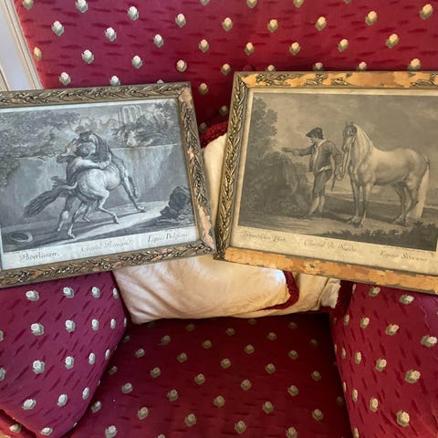 Tavlor med olika motiv. En tavla föreställer ett närgånget hästmotiv i mörka toner 90x120cm, små märken på den 250kr.