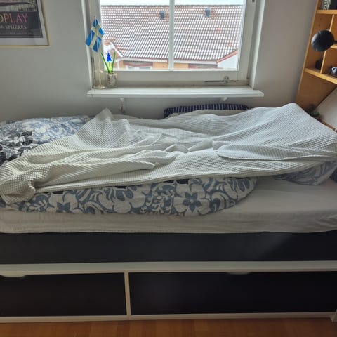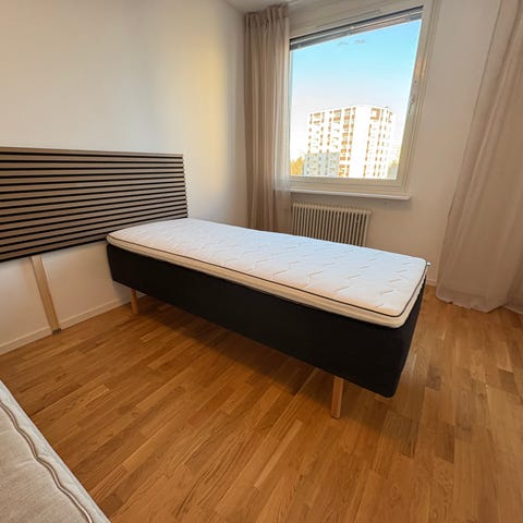 90cm med resårmadrass. Säljs utan överdrag och bäddmadrass av hygienskäl. Har knappt använts (gästsäng). Ca 5 år gammal.