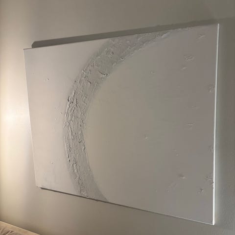 Tavla med abstrakt motiv i svart och vitt. Konstverket visar ett virvlande, cirkulärt mönster i ljusa toner mot en mörk bakgrund. Passar som väggdekoration i vardagsrum, sovrum eller kontor. Målad på kvadratisk duk eller skiva med markerad ramkant runt motivet.