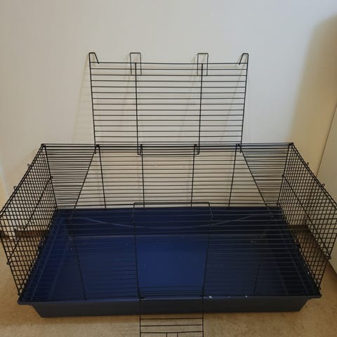 bur i svart metall med plastbotten. Lämplig för mindre djur som kanin eller marsvin. Burens sidor består av galler med öppningsbar topp och frontlucka. Invändigt finns utrymme för strö, hö och vattenflaskor. Passar för inomhusbruk på plant underlag.