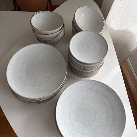Ferm Living porslinstallrikar och skålar i grå ton. Setet består av plana tallrikar och mindre skålar i matchande färg. Passar för servering av vardagsmåltider som frukost, lunch och middag. Neutralt utförande som fungerar i de flesta kök och dukningar.