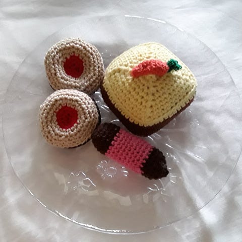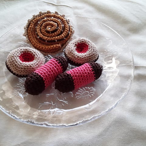 Ett set med virkade bakverk. Ingår - en kanelbulle, en muffins och två dammsugare. Perfekt för barnens lek eller som dekoration.