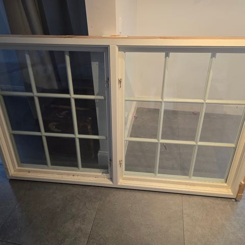 2 st stora fina gamla fönster med spröjs. Gammalt fint glas (ev munblåst) Gamla fönster som passar bra till växthus, orangeri, mellanvägg, rumsdelare eller liknande projekt.