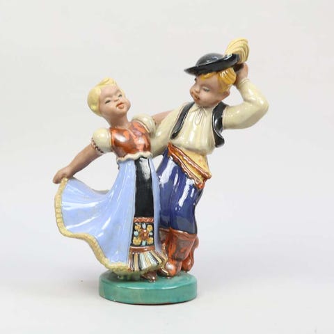 Wallendorf porslinsfigur föreställande en sittande ballerina. Figuren är huvudsakligen vit med detaljer i guld, bland annat på skon. Klänningen har flera volanger och figuren sitter på en dekorerad bas. Undersidan är märkt med Wallendorfs stämpel. Passar som prydnad i vitrinskåp, på hylla eller sidobord. Samlarobjekt. Säljs till högsta bud.