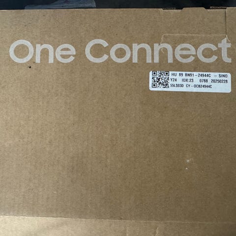 Samsung Frame 65” 2019, QE65LS03RAU, med tillhörande mediabox, fjärrkontroll och väggfäste ingår. Anslutningar finns på mediaboxen, som kopplas till TV:n med kabel.