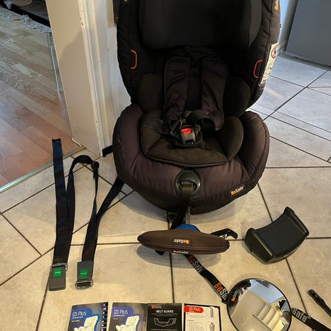 Bakåtvänd bilbarnstol och bas. I bra använt skick. Klädsel går att tvätta, vi har ej gjort det inför försäljning. Gummit som täcker knappen till att ta ut och in bältet är slitet, se bild.