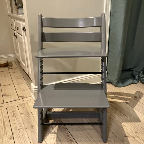 Stokke Tripp Trapp matstol i vitlackerat trä. Justerbar sitthöjd och fotstöd som kan anpassas efter barnets storlek. Stolen kan användas från småbarnsålder och uppåt. På bilderna syns även en sittdyna och bygel som ger extra stöd för mindre barn.