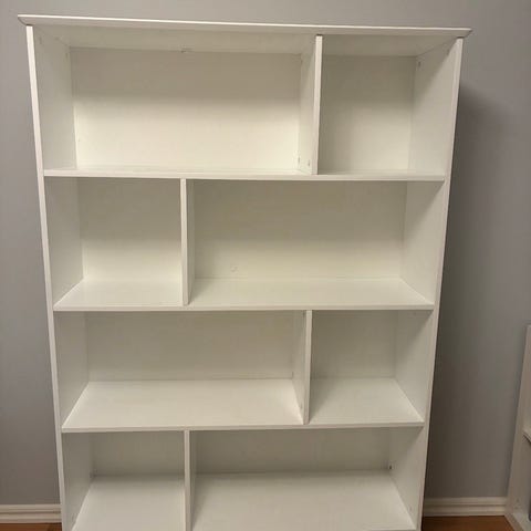 Hyllan är i ek men ommålad i vitt med 6 fack.